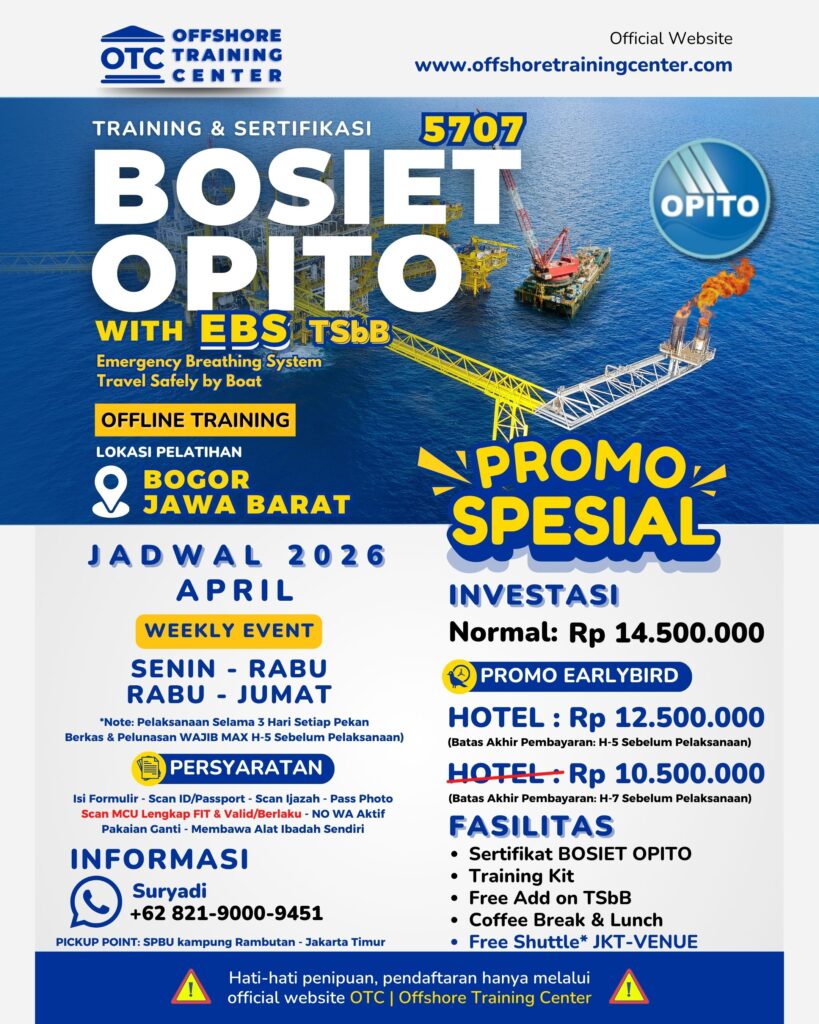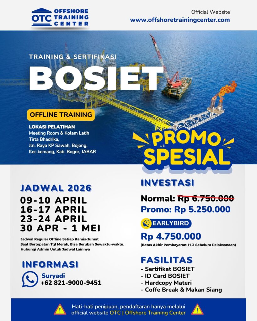 Dapatkan DISKON PELATIHAN BOSIET Rp 1.000.000,- & EARLYBIRD (berlaku untuk pelunasan H-3 sebelum pelaksanaan)